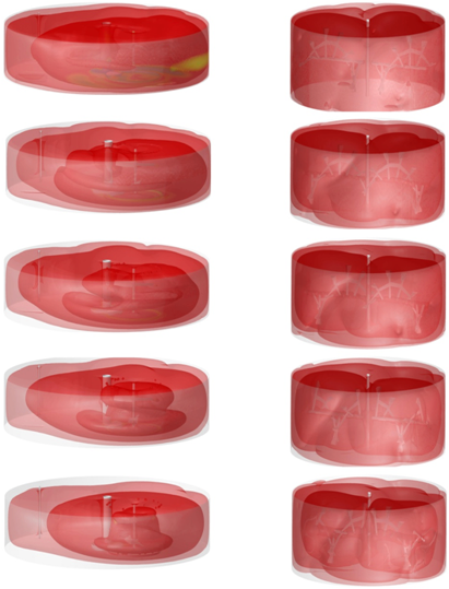 Velocity in the digesters with decreasing rotation number, left column Plant A from 15 down to 4rpm, right column Plant B from 7 down to 2rpm