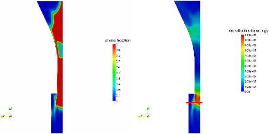 Plot of phase fraction α and specific kinetic energy at the exit of the simulated geometry