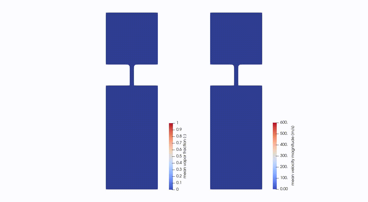 Fig. 2: Mean gas phase fraction (left) and mean velocity magnitude (right) of the nozzle with expansion case.