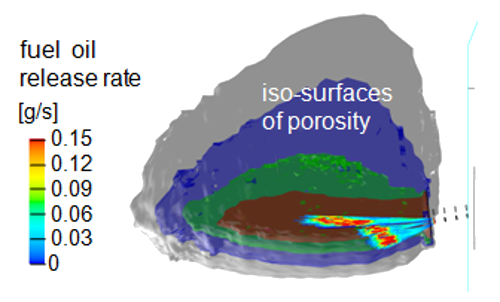 Trajectories of injected fuel oil, iso-surfaces of porosity profile near the tuyère opening
