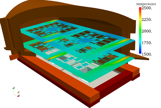 Kiln geometry with temperature (in K) on two surfaces at the height of the center of the burners